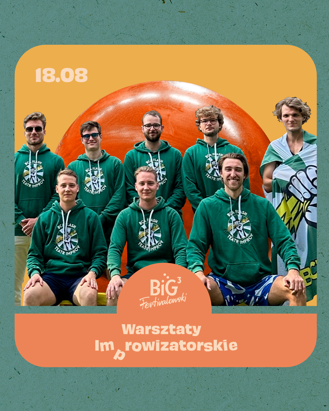 o, Ty też od rana chodzisz dziś w szlafroku?” – jak byście dalej poprowadzili ten dialog? Szykujcie się na solidną dawkę śmiechu i kreatywnego szaleństwa! 17 sierpnia na BiG Festivalowskim Grupa BCA Flash Teatr Improv pokaże wam, jak improwizować tak, że ludzie popłaczą się ze śmiechu. Na warsztatach poznacie aktorskie rozgrzewki, impro triki i techniki wspólnego improwizowania – wszystko w lekkiej i zabawnej formie. Chcecie spróbować? Szczegóły i zapisy już wkrótce!